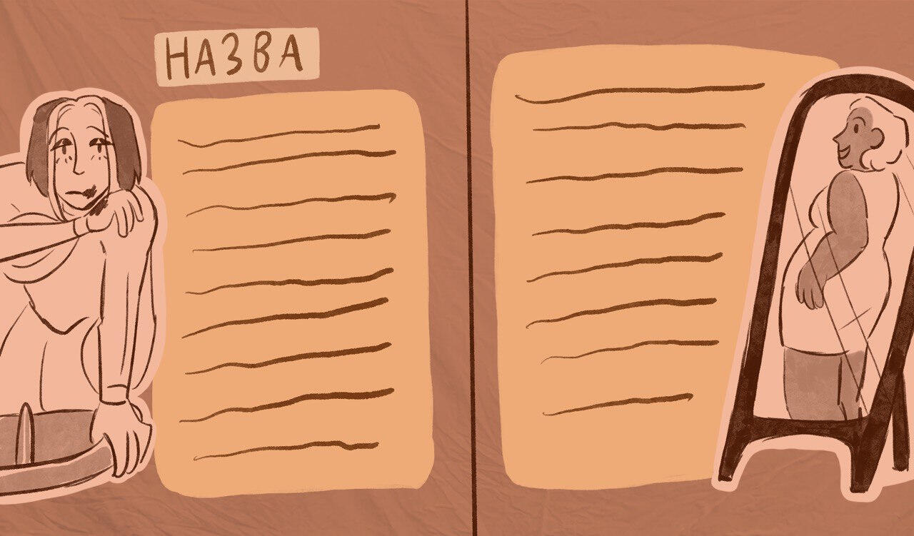 Це лише приклади для розуміння, чого саме очікувати від проєкту та від вимог до творів збірки.✦ Перший блок містить тему, яка оголошується на початку розвороту, та шість сторінок ілюстрацій і тексту, які створюються в парі художницею та письменницею, лише приблизно обмеженими шаблонами, тому кожен розворот може бути унікальним.Нижче наведені приклади тем та приклади їхньої реалізації, однак це залишиться на вибір митців (який у будь-якому випадку буде контролюватися організацією).ㅤㅤ✦ «Жінка має право бути собою незалежно від суспільних стандартів краси»Основний малюнок: жінка, що стирає макіяж.
